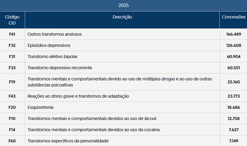 O levantamento integra o balanço nacional do Instituto Nacional do Seguro Social (INSS), que aponta 546.254 benefícios por transtornos mentais em 2025, um crescimento de 15,66% em relação a 2024.
