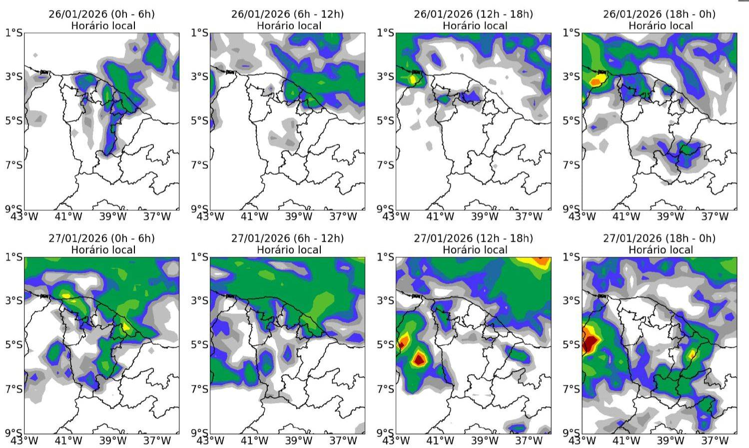 A cidade de Teresina pode registrar chuvas fortes nas próximas 24h, segundo alerta da Defesa civil do município emitido com base nos mapas de previsão meteorológica da Fundação Cearense de Meteorologia e Recursos Hídricos (Funceme).